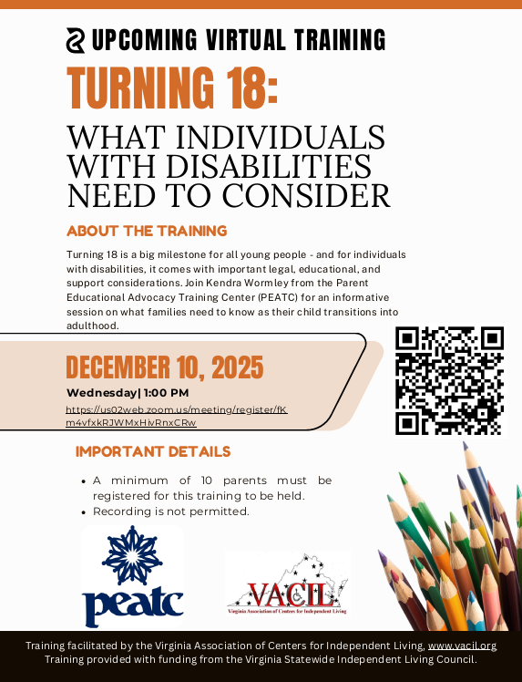 Turning 18: What Individuals with Disabilities Need to Consider (1:00pm, virtual)